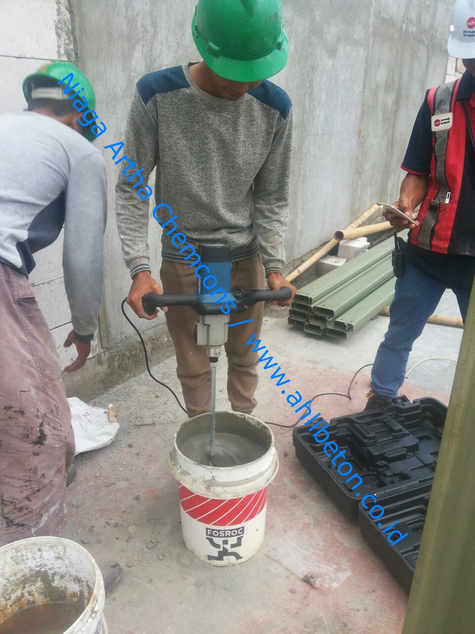 Material yang digunakan pada pekerjaan ini adalah Conbextra GP ex Fosroc, Conbextra GP premix, dengan volume kerja 4600 kg.  Pekerjaan ini bersamaan dengan aplikasi chemical anchor yang akan kami bahas pada artikel berikutnya.