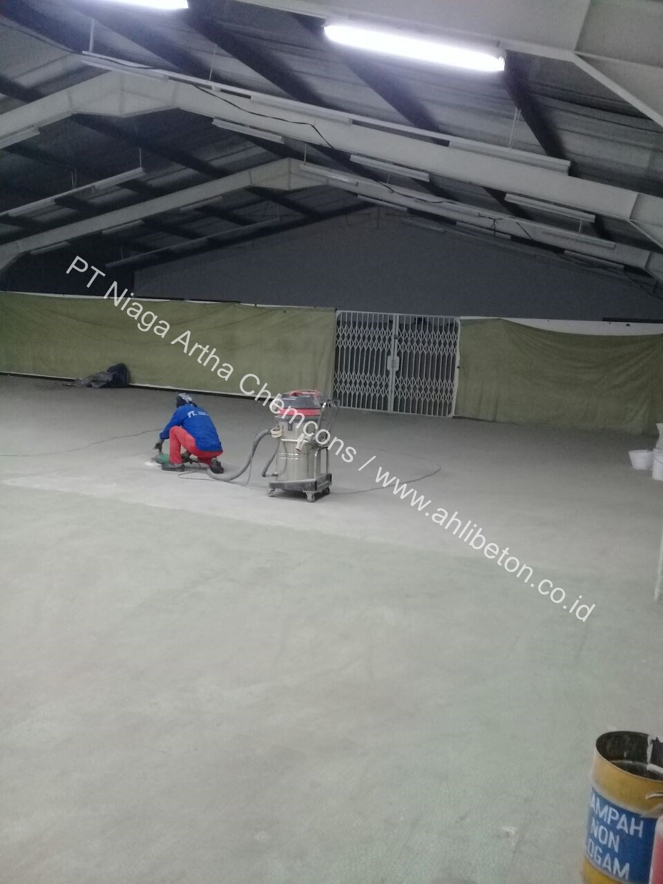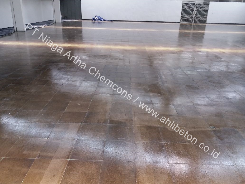 Material coating khusus untuk lantai yang kami gunakan bertujuan untuk membuat area bebas debu yang berasal dari hasil abrasi permukaan baton atau tegel existing serta mempermudah pemeliharaan dalam hal ini mudah dibersihkan, selain tampilan “wet look” dan glossy material epoxy ini pula menutup pori dan porous pada permukaan sehingga tumpahan bahan cair seperti oli, minyak dan lainnnya tidak dapat meresap pada beton atau tegel.
