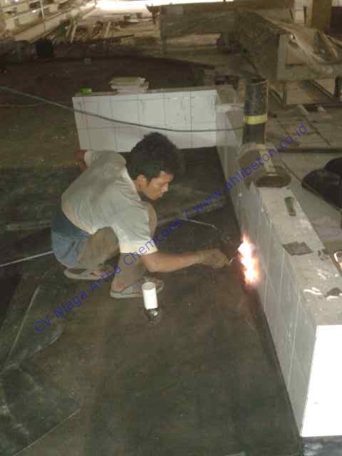 Dalam pengerjaannya, terlebih dahulu lantai kerja dibersihkan dari minyak, dari debu, dan kotoran-kotoran yang menempel sampai benar-benar bersih, kemudian melapisi permukaannya dengan primer menggunakan roll ataupun kuas. Kemudian pada permukaan yang telah disiapkan tersebut dibentangkan lembaran material membrane dan menempatkan posisi lembaran agar lebih baik sehingga membentuk pola dan kemudian dilakukan proses pembakaran dengan heating tips kemudian direkatkan pada permukaan beton sampai benar-benar melekat tanpa merubah posisi lembaran pada susunan pola sebelumnya.